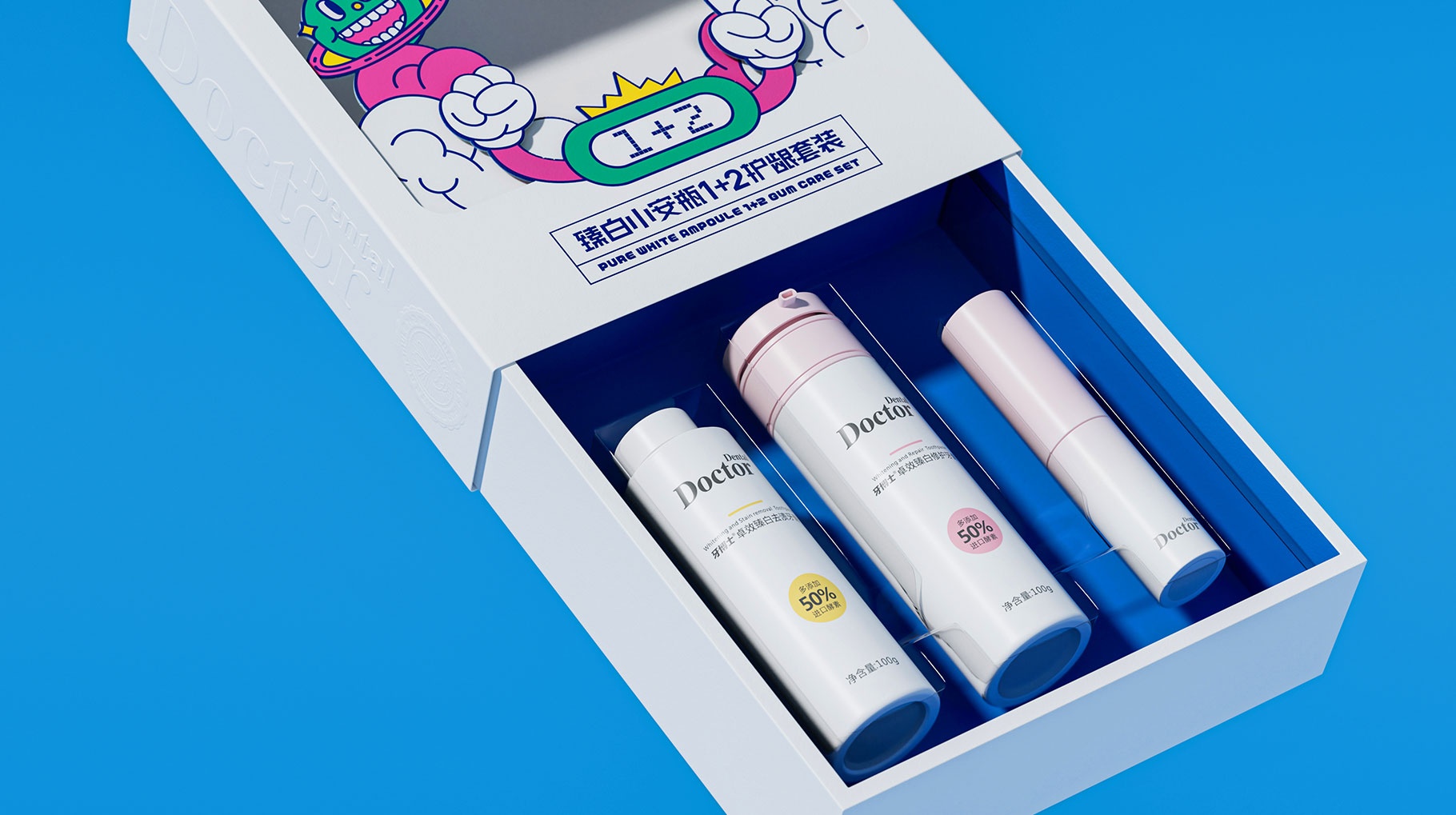 以有趣為內(nèi)核,在包裝設(shè)計(jì)中融入日常口腔洗護(hù)場(chǎng)景,牙膏的氣泡、刷牙之后的清爽心情、擁有潔白牙齒的開(kāi)心等這些熟悉的動(dòng)作感受。從視覺(jué)設(shè)計(jì)延伸至對(duì)消費(fèi)者的情緒設(shè)計(jì)。以清新的視覺(jué)色系作為整體包裝的主色調(diào),對(duì)比中兼有飽和度的融合。運(yùn)用大膽、新穎、有趣、幽默、可愛(ài)的視覺(jué)符號(hào),觸動(dòng)消費(fèi)者使用產(chǎn)品場(chǎng)景的想象力。在符合產(chǎn)品的調(diào)性之下,不失活潑與活力。
